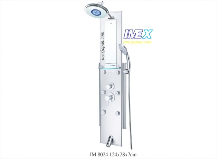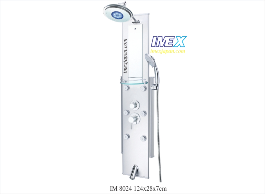Sen bảng massage, 4 chức năng. Tắm kiểu mưa, tắm đứng vòi sen chỉnh 3 - 7 chức năng linh hoạt, 6 jets massage đứng điều chỉnh kiểu phun, vòi xả nước, kiếng soi, kệ để đồ. khóa mở nước chỉnh nóng lạnh bằng tay gật gù, núm nhỏ là chuyển chức năng Chất liệu nhôm và inox. Kích thước: 1240*280*65mm