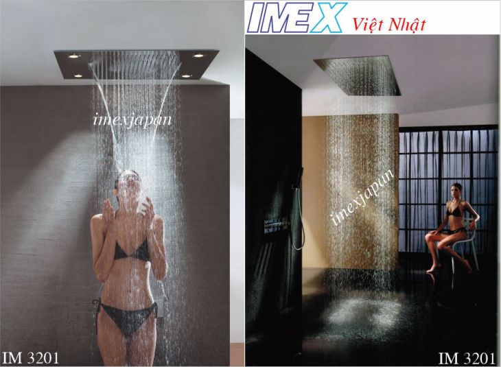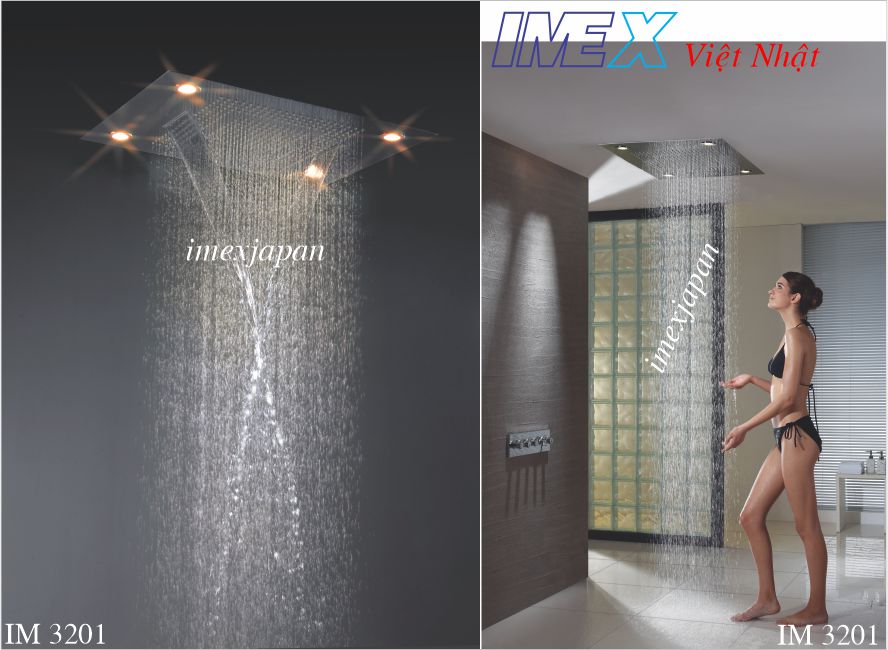 Sen tắm âm tường, đài sen âm trần kiểu mưa và thác nước loại lớn 600x800mm, có cùng đèn. Sen tắm đứng linh hoạt điều chỉnh 3 - 7 chức năng. khóa mở nước và chỉnh nóng lạnh bằng 2 núm vặn, chuyển chức năng bằng 3 núm riêng biệt, củ nước cần phải đặt trước khi ốp gạch. Cần áp lực nước mạnh. Chất liêu inox và đồng mạ crom