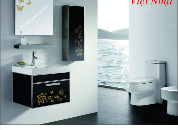 lavabo tủ inox mờ 304, tô sứ có xả chống tràn, bao gồm vòi, xả và kiếng soi, kệ. chưa có tủ kế bên. kích thước:750*460mm