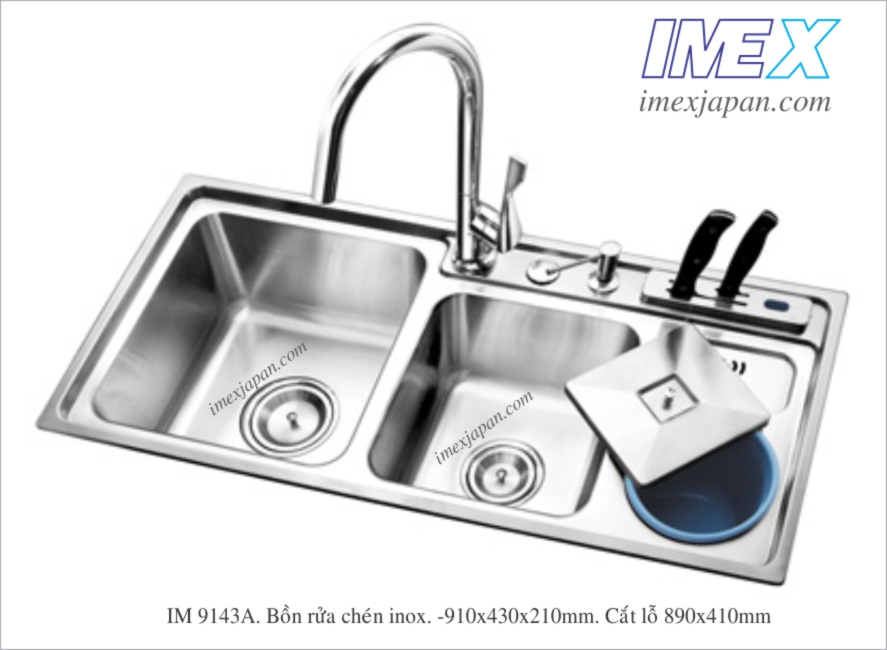bồn rửa chén inox SUS304, 2 ngăn đúc liền khối, có ngăn chứa dao, túi đựng rác ,kiểu dáng: lắp âm bàn đá, KT: 910x430x210mm